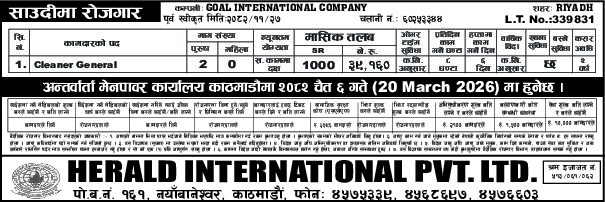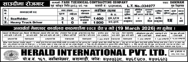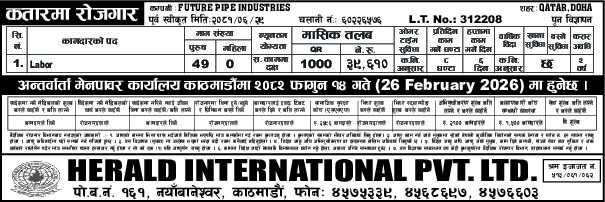 Established in 2004 AD, Herald International Pvt. Ltd., have since been providing recruitment services for all the job seeking individuals all around the country. We have been helping the youths get rid of unemployment, secure a future and increase foreign remittance.